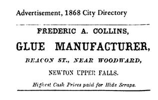 Frederic Collins and his brother began a glue factory on 5 acres of land (at the end of Gould Road) adjacent to the Charles River. At the time there were few glue makers in this country, and fish and bone glues were as yet unknown. The enterprise was evidently profitable since b 1855 it had expanded to include three factories. Soon after the death of Edward Collins, in 1879, the business was discontinued.