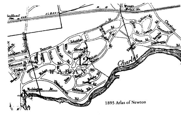 While land sales were booming elsewhere in Newton at the beginning of the 1880's, Waban, with less than 20 houses, remained sparsely settled. Although Chestnut Street had been extended to the Upper Falls and Beacon Street (between Newton Centre and Chestnut Street) had been laid out by mid century, accessibility was still poor. In the 1870's there had been some speculation in land, prompted by talk of extending the railroad west of Newton Highlands. However, two proposals came to nothing before the Boston and Albany agreed to construct the Highland Branch. One, the Hoosac Tunnel or North Western Railroad, was surveyed from Brookline to Riverside via Oak Hill, South Newton Highlands, Upper Falls, and Waban. The other, by the Brighton and Newton Railroad, was to connect Newton Lower Falls via Waban, Cold Springs City and Newton Centre to Boston. In anticipation of the latter, the Nonantum Land Associates purchased and subdivided the 76 acre Varick Estate at the corner of Washington and Beacon Streets into 195 small building lots. The subdivision and the proposed railroad are shown on the 1874 City Atlas, but were never carried out because of the nation‑wide economic depression which had a serious impact locally.