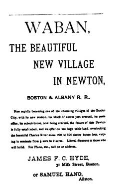 James F. C. Hyde entered the Waban real estate market during the late 1880's by announcing the sale of 130 house lots in a large advertisement taking up half the front page of The Newton Graphic. According to a local history, 53 lots were sold off almost immediately.