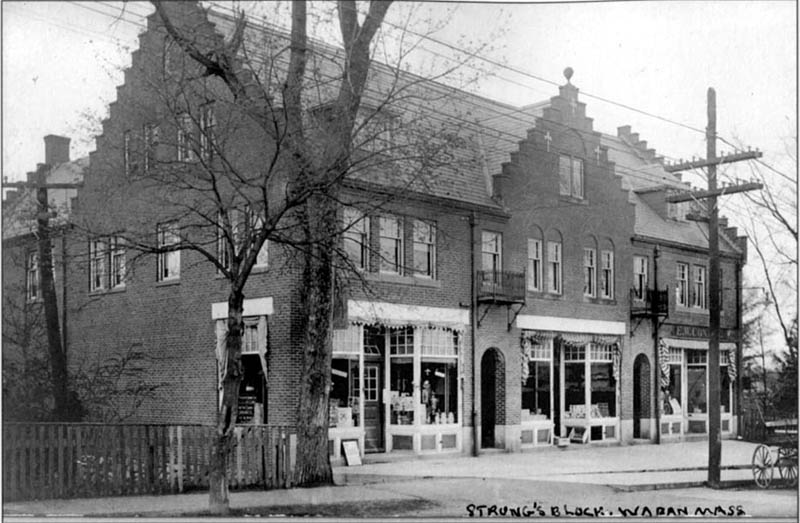 William C. Strong commissioned the firm of Bacon & Hill, architects (Lewis H. Bacon and Clinton Hill were both Waban residents) to design a building to accommodate several village stores with good‑sized apartments above. The distinctive Dutch style block was completed in 1897, prominently sited in the s are at 1641‑1649 Beacon Street. A rendering of its design appeared in the October 31, 1896 edition of American Architect sand Building News.